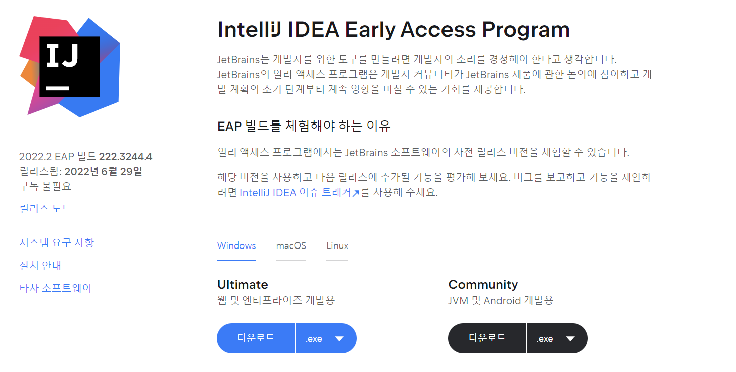 https://www.jetbrains.com/ko-kr/idea/nextversion/#section=windows