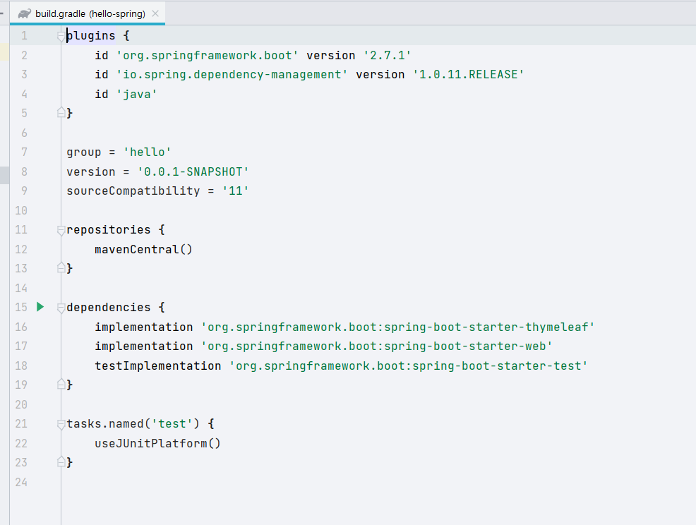 dependencies는 처음 프로젝트를 생성할 때 추가했던 thymeleaf와 Spring Web이 들어가있는 것을 확인할 수 있고