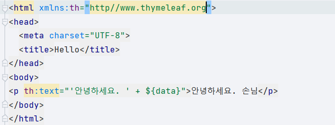 hello.html 파일을 생성해주고 작성해주는데 여기서 th는 thymeleaf의 문법이다.