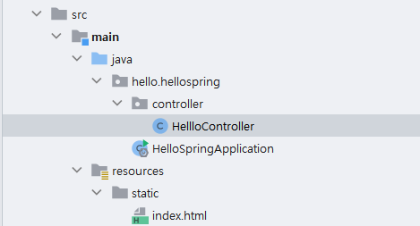 패키지 안에 HelloController.java를 하나 만들어주는데 이렇게 하면 웹에서 hello라고 들어오면 Spring 기능인 @GetMapping 어노테이션 부분의 메서드를 호출해준다.
