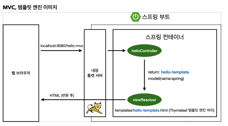 웹 브라우저에서 localhost:8080/hello-mvc를 서버한테 보내고 서버는 스프링 컨트롤러에게 던진다.