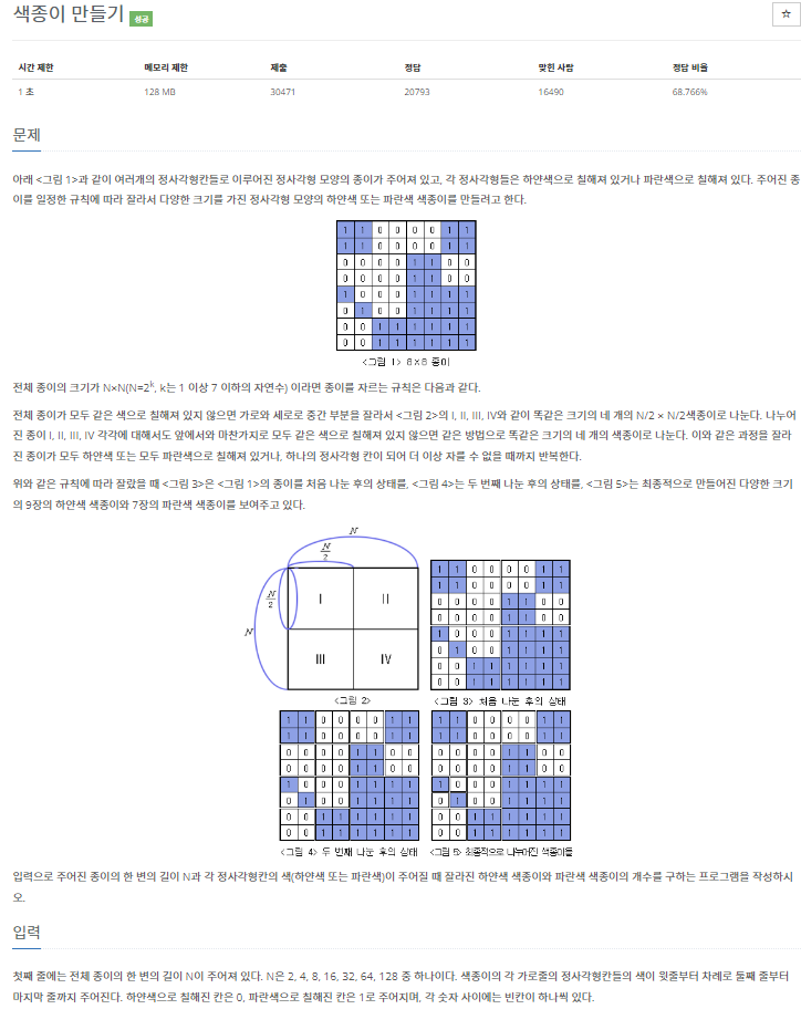 이 색종이 만들기 문제는 백준에서는 분할 정복 알고리즘으로 분류되어 있다.