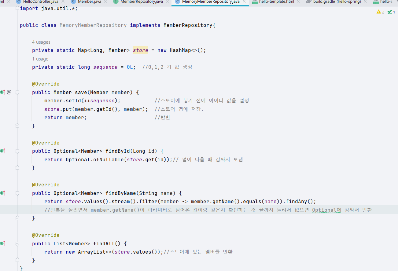 구현체를 만들어서 앞에서 선언해준 기능들을 재정의(Override)해줄 것이다. 먼저 앞서 만든 MemberRepository를 implements해주고 Alt + Enter을 해서 MemberRepository의 추상 메소드를 재정의 한다.먼저 save에서 Map을 사용할 것인데 그것을 위해 store라는 참조변수를 만들어준다.실무에서는 이렇게 공유되는 변수일 때 동시성 문제가 생길 수 있어 ConcurrentHashMap을 사용해야하는데예제이기 때문에 일반 HashMap을 사용해주었다. 그리고 sequence를 선언해주는데 이것은 id에 들어갈 값을 단순하게 0, 1, 2 키 값을 생성해주는 것이라고 생각하면 된다.이것도 실무에서는 Atomic Long을 사용해주어야 하는데 마찬가지로 예제이기 때문에 이렇게 사용했다.그리고 member.setId(++sequence)로 시스템이 정해주는 id로 설정하고 저장해주어 반환한다.