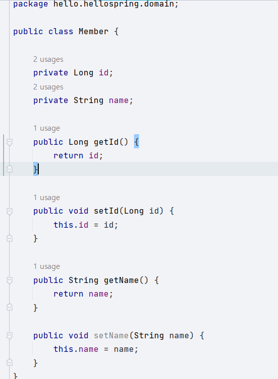 Long 타입의 id와 String 타입의 name 두 가지를 만들어 주었다. 여기서 id는 DB에 저장할 때 사용하는 단순