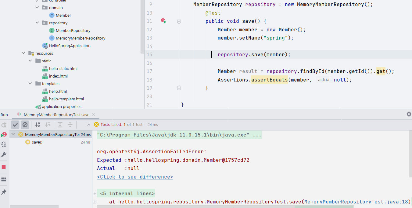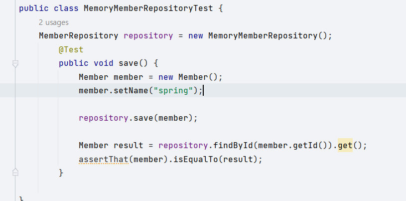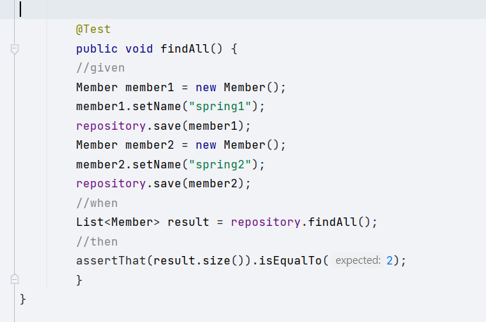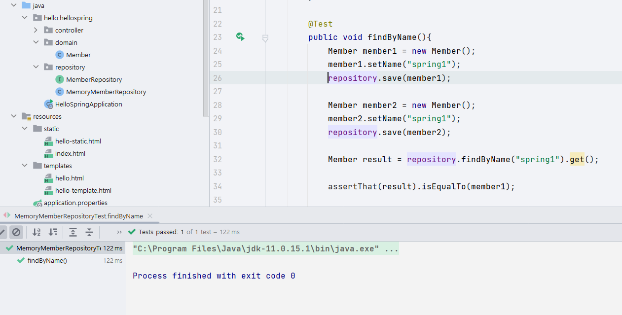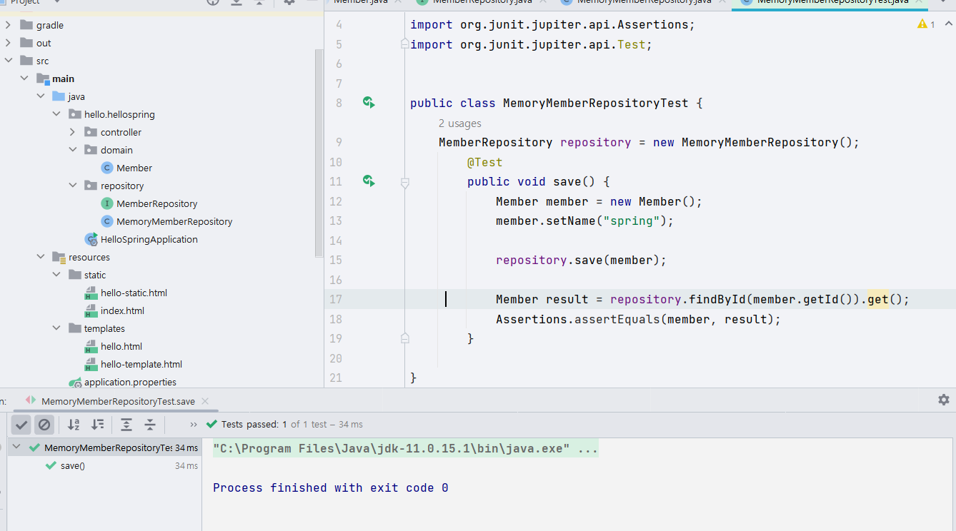 이번 예제에서는 먼저 repository를 개발한 다음에 테스트 케이스를 작성했다.