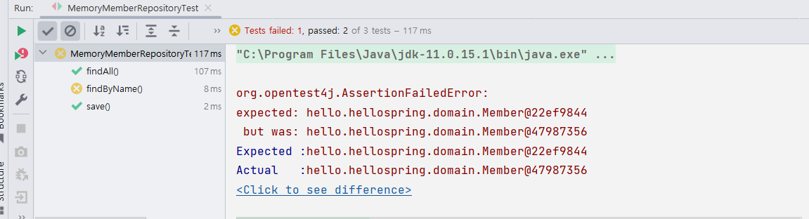 전체 테스트를 진행하였는데 findByName에서 오류가 나는 것을 확인할 수 있다.