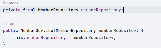 MemberService로 돌아가 위와 같이 수정해주고 Ctrl + N을 눌러 생성자를 만들어주어 외부에서 넣도록
