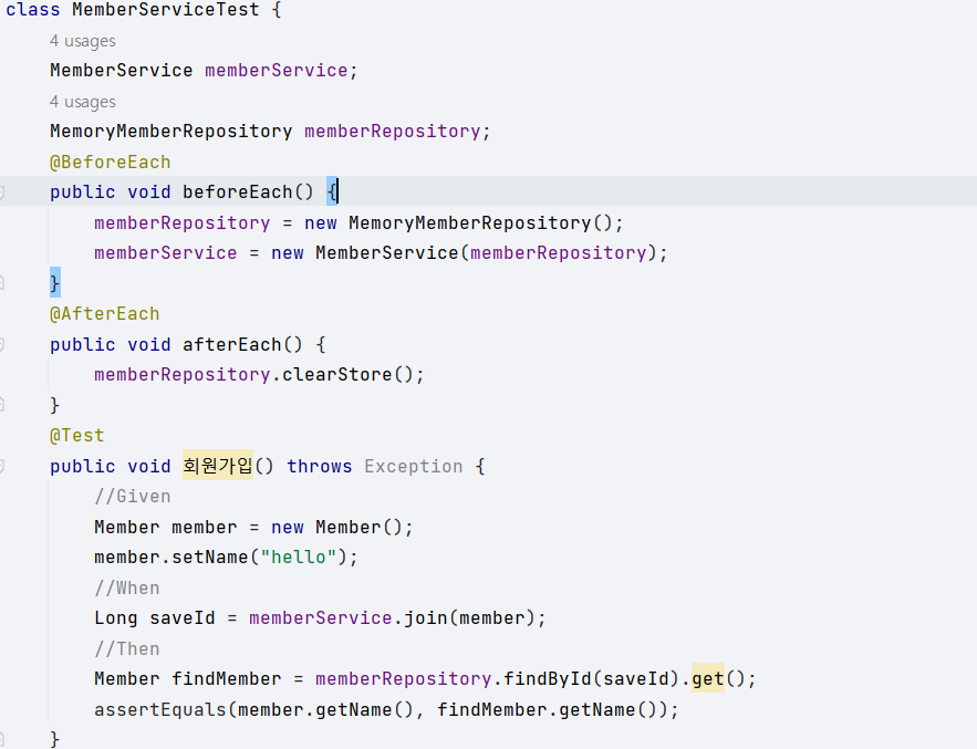 이대로 실행한다면 문제없이 돌아가겠지만 전 테스트 시간 처럼 member에 hello가 아니라 spring가 들어간다면